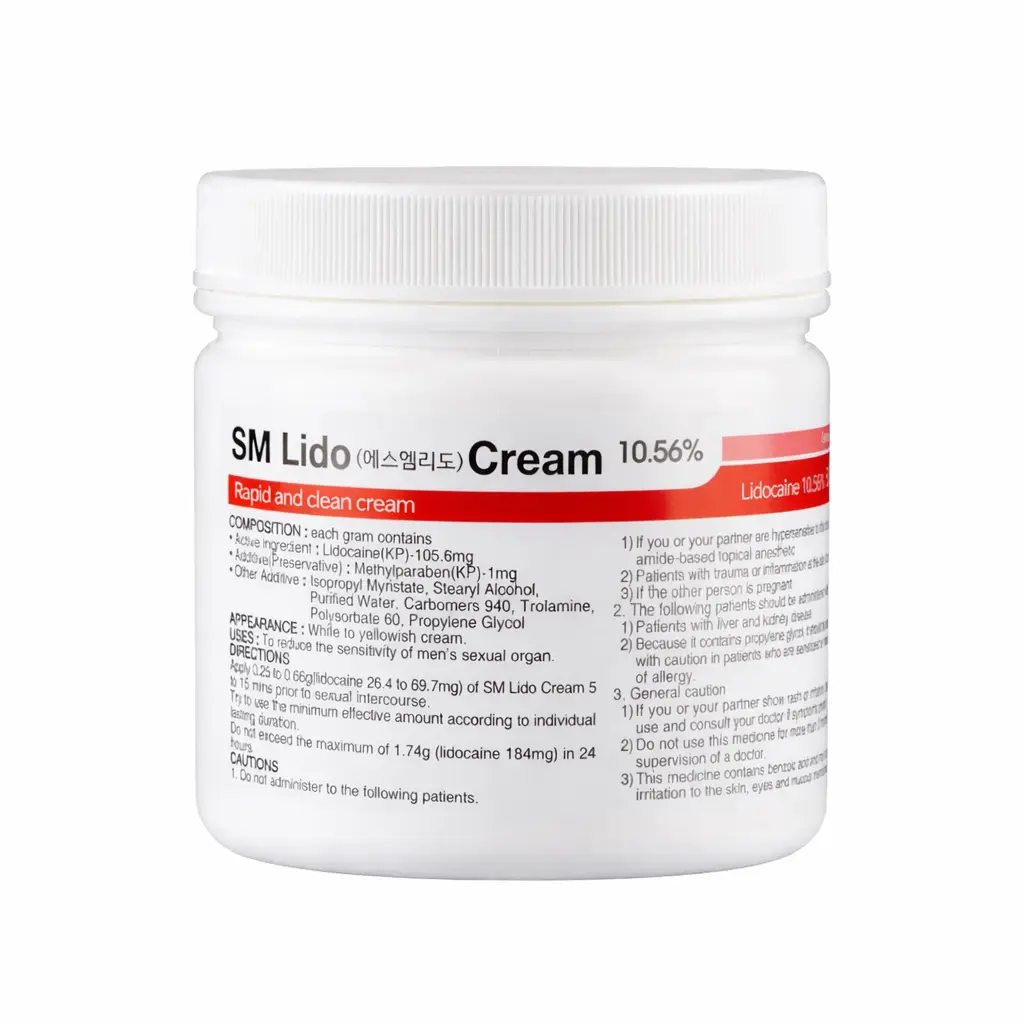 SM Lido Cream 10.56% es una crema anestésica tópica de uso profesional que contiene lidocaína como principio activo, proporcionando efecto anestésico local temporal.